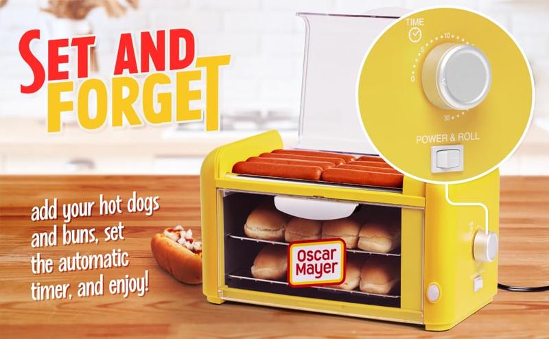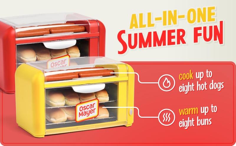 Grill up to 8 hot dogs on 5 stainless steel rollers while warming 8 buns on dual racks—perfect for parties, family dinners, dorms, camping, or picnics. Features an adjustable timer, STOP toasting button, and see-through doors to monitor cooking. Compact, easy to use, and quick to clean with a removable crumb & drip tray. Classic Oscar Mayer design for fun gatherings every time! 🎉