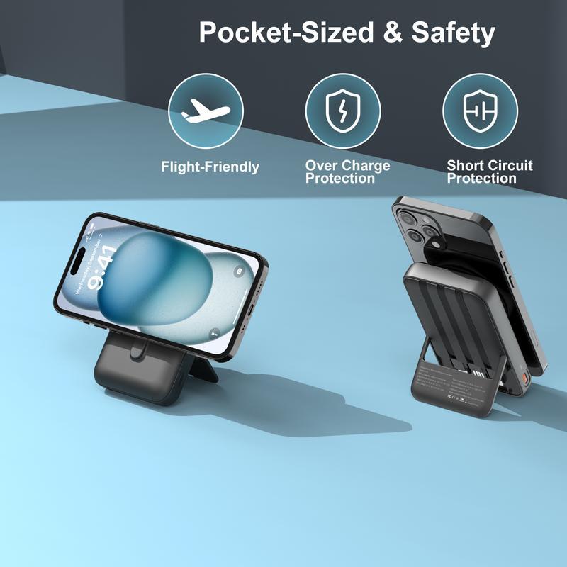 Built-in Three Cables & Foldable Stand: The wireless portable charger for iPhone has built-in two charging cables and a USB input cable, perfectly compatible with iPhone or Type-C devices, no need to carry extra cables; The Magnetic Wireless Portable Charger with a built-in foldable stand can replace mobile phone stand that keeps your iPhone 16/15/14/13/12 upright for a comfortable viewing angle. 5 Devices Charging Simultaneously: The magnetic power bank for iPhone supports up to 10W wireless charging; USB-C output up to 20W; up to 22.5W USB-A output; supports up to 10W Lightning output and up to 20W USB-C output; Note: Supports charging up to 5 devices at the same time(Total output power at this time: 12.5W, 5V-2.5A), shared charging with no waiting. Superior Safety: With a high-density lithium polymer battery has the new cooling technology, this latest magnetic portable charger has a comprehensive multi-protect safety system that specifically includes temperature control, overcharge protection, and short circuit protection; The Multi-Protect safety system ensures that your devices are shielded from potential hazards, providing you with a worry-free charging experience Strong Magnetic & Suitable for a Wide Range of Devices: The portable wireless charger with magnetic technology can directly hold the back of your iPhone: iPhone 16, iPhone 16 Plus, iPhone 16 Pro, iPhone 16 Pro Max, iPhone 15, iPhone 15 Plus, iPhone 15 Pro, iPhone 15 Pro Max, iPhone 14, iPhone 14 Plus, iPhone 14 Pro, iPhone 14 Pro Max, iPhone 13, iPhone 13 mini, iPhone 13 Pro, iPhone 13 Pro Max, iPhone 12, iPhone 12 mini iPhone 12 Pro, and iPhone 12 Pro Max. The built-in charging cable output and charge port are compatible with a variety of other phones. 10000mAh Capacity : Our 10000mAh large capacity magnetic wireless power bank can provide long time power need, providing enough power for your device when you are on outdoor trips, camping, hiking, or other activities, without worrying about insufficient power. Charging Guide: Magnetic wireless charging : Only for iPhones 1.From iPhone 8 to iPhone 11 (Wireless Charging|No Built-in Magnets)"Supports wireless charging, but WON’T magnetically attach—unless you use an official MagSafe case!"; 2. For iPhone 12 & Above (Wireless + Magnetic ):"Snap & charge! Strong magnetic alignment for the fastest, most secure wireless charging. Wireless Charging : All phones(with wireless charging function) Wired charging only: iPhones below iPhone 8 & Android phones without wireless charging, use the correct cable for your device. What you will get : 1*power bank 1*Instructions Note : This product does not contain an additional charging cable .