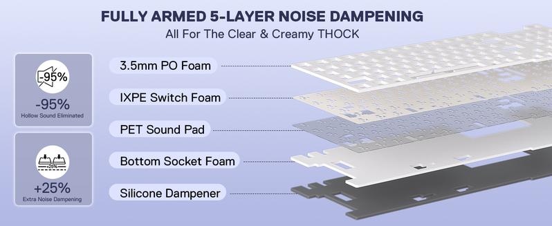 5-Layer Noise Dampening – Equipped with multiple foam and silicone layers to reduce hollow sounds, creating clean and satisfying typing acoustics.